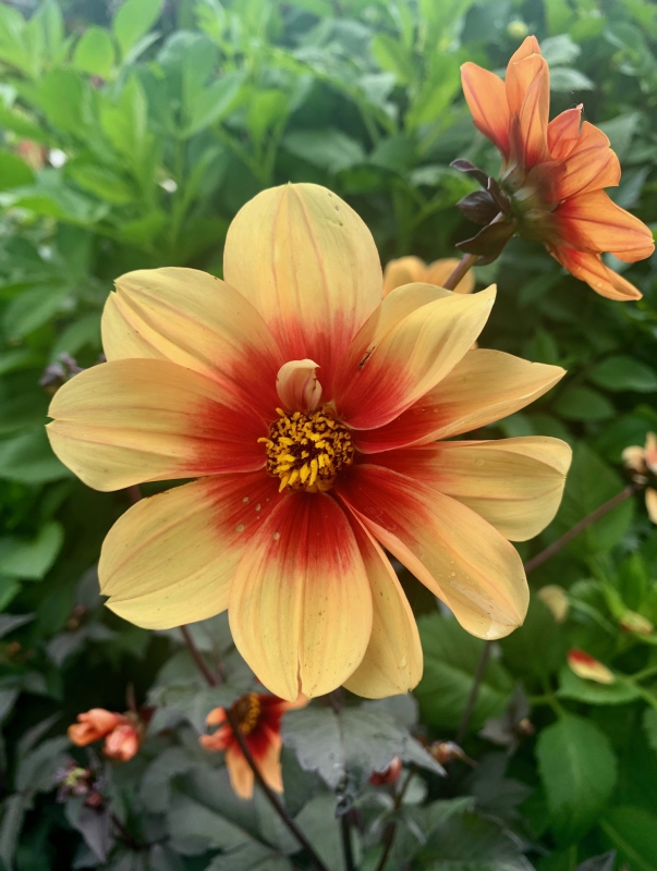 Enkelbloemige Groep, enkele krans lintbloemen rondom open hart van buisbloempjes, donkerbladig, goed doorlatende niet te droge voedzame grond, zeer rijk- en langbloeiend, uitgebloeide bloemen verwijderen, knol vorstvrij in donker overwinteren, vlinder- en insectenplant, oorspronkelijk afkomstig uit Mexico en Midden-Amerika