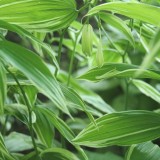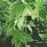 Langwerpige klokvormige bloem met groene punten, heldergroen onregelmatig wit gestreept blad, snelgroeiend, bodembedekker, wortelstok, glimmend zwarte bes, humeuze grond, afkomstig uit Japan.
