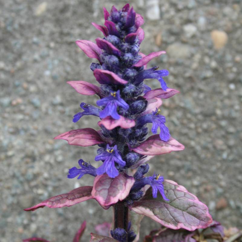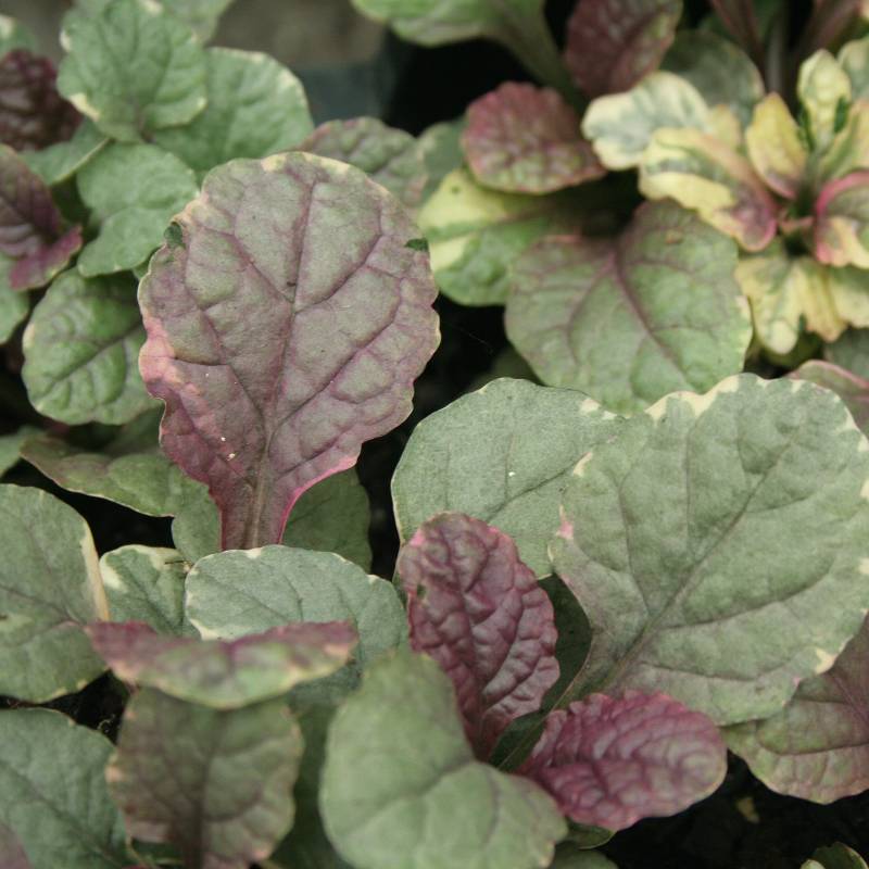 Gedrongen opstaande bloemaar, rozepaars-crèmewit-groen bont blad, bodembekker, wintergroen, niet te droge goed gedraineerde grond, insectenplant, oorspronkelijk afkomstig uit Europa