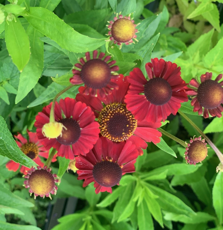 Eénkleurige straalbloem, roodbruine kegel, verkleurt niet, compact, rijkbloeiend, ook mooi in pot, niet te droge grond, goede drainage, insecten- en vlinderplant, oorspronkelijk afkomstig uit Noord-Amerika, introductie van Bob Brown