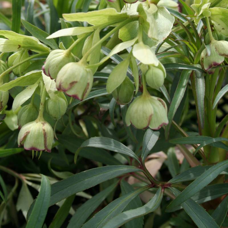Klokvormige bloem met donkerrode rand, bloemtros, korte stengel, rijkbloeiend, donkergroen ingesneden iets glanzend langwerpig blad, wintergroene pol, kan zich uitzaaien, humeuze grond, verdraagt ook droge schaduw, windschut, insectenplant, afkomstig uit Zuidwest-Europa