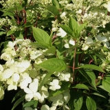 Grote witte bloempluim verkleurend via lichtroze naar donkerrood in september, rode stevige recht opgaande stengel, bloei op eenjarig hout (snoeien met behoud van bloei), niet veeleisend, niet te droge vruchtbare grond, oorspronkelijk afkomstig uit Japan en China, selectie van Wim Rutten
