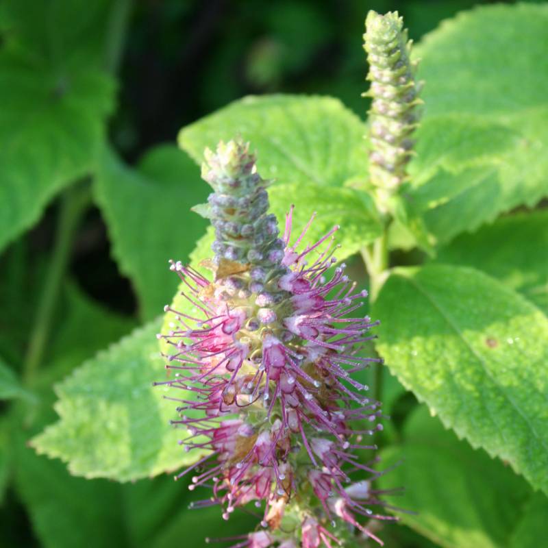 Kleine kransbloem met zeer lichtblauwe kelk en ver uitstekende dieproze meeldraden aan lange forse bloemaar, stevige stengel, opgaande groeiwijze, groot behaard grijziggroen hartvormig blad, voedzame goede gedraineerde grond, beschutte plek, 's winters afdekken, afkomstig uit Japan, introductie van Bleddyn en Sue Wynn-Jones.