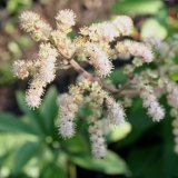 Slanke hoge vertakte bloempluim aan hoge stevige roodbruine stengel, jong bronskleurig blad, groot glanzend bronskleurig kastanje-achtig blad, bossige groeiwijze, herfstkleur, forse sterke bodembedekker, vochtige voedzame grond (rijkerbloeiend en meer vochtbehoefte op zonniger plek), niet snelgroeiend, oorspronkelijk afkomstig uit China, Korea en Japan