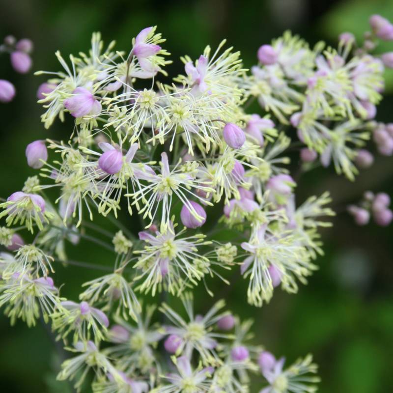 Kleine kelkvormige bloem met toef crèmegele meeldraden, groot vertakt luchtig bloemscherm, zeer hoge stevige dieppurperen stengel, grijsgroen akelei-achtig blad, forse stevige bossige groeiwijze, voedzame niet te droge goed gedraineerde grond, windbeschutte plek (geen uitdrogende zomerwind), bij voorkeur geen felle zon midden op de dag, insectenplant