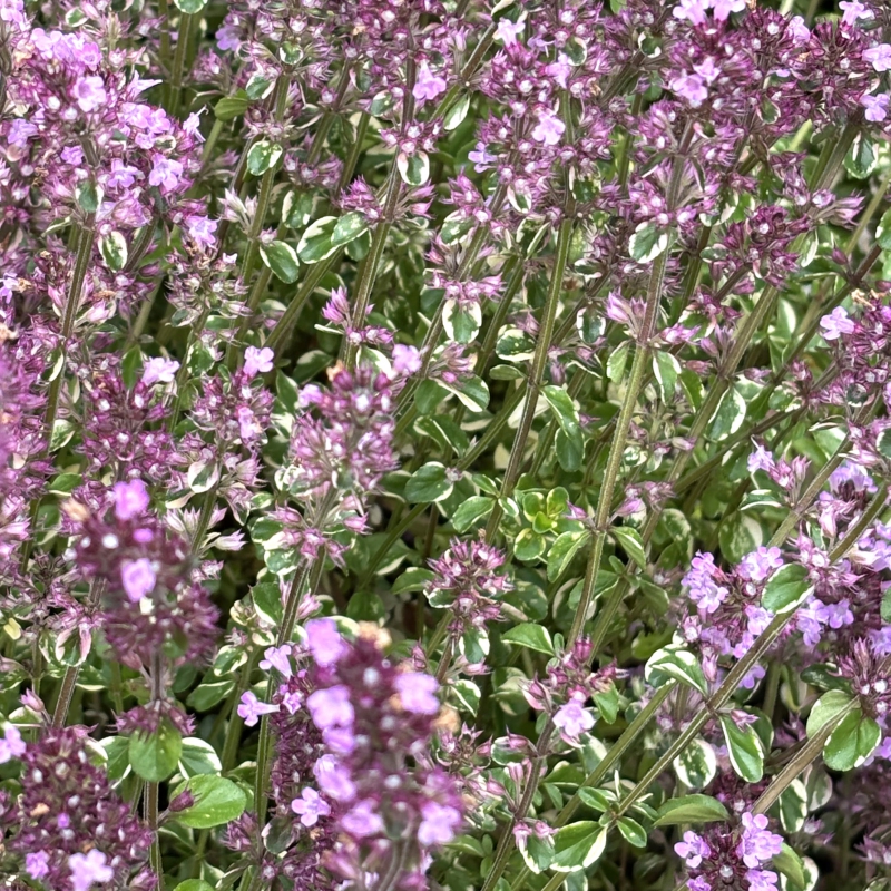 Bonte, grootbladige tijm, die het ook in de halfschaduw nog goed doet.