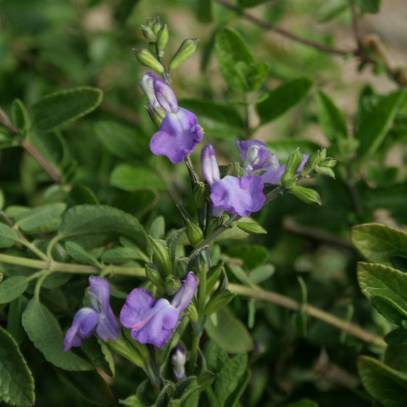 Lipbloem met korte helmvormige bovenlip en grote brede onderlip, donkere kelk, lange opgaande bloemaar, zeer rijk- en doorbloeiend, uitgebloeide bloemstengels afknippen voor herbloei, dunne houtachtige stengel, klein glad licht aromatisch glanzend blad, struikachtige groeiwijze, verdraagt droogte, goede drainage, insectenplant, beschutte plek, bij strenge vorst afdekken of vorstvrij overwinteren, Franse selectie, oorspronkelijk afkomstig uit Mexico en Zuidelijke Staten van Noord-Amerika.