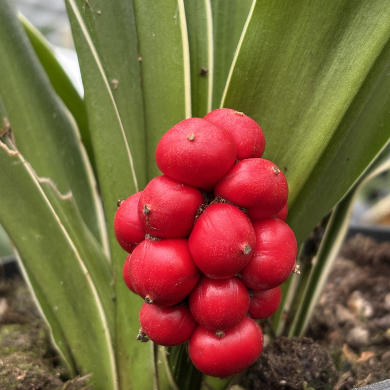 Korte gedrongen bloemknots, langwerpig stevig blad met crèmewitte rand, rode bessen, wintergroen, langzaam groeiend, droge goed gedraineerde grond, beschutte plek, in pot vorstvrij overwinteren of bij vorst met blad afdekken, al sinds eeuwen een populaire Japanse potplant, afkomstig uit China en Japan.