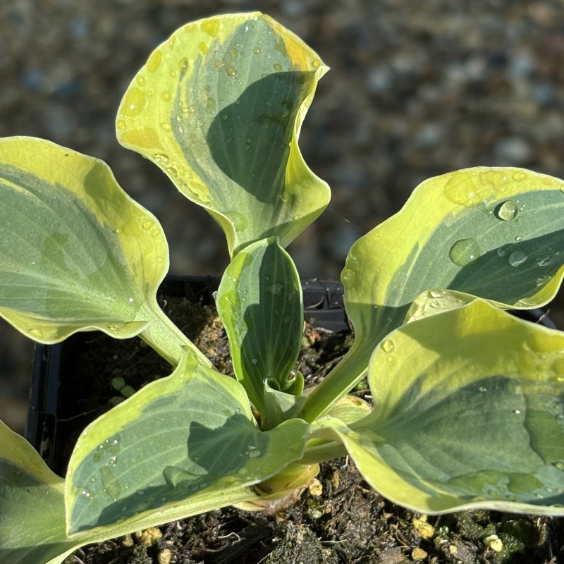Mini-hosta met dik blauwgroen blad met brede crèmegele rand. Compacte groei.