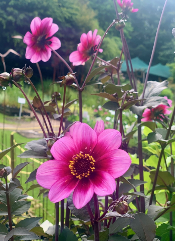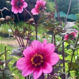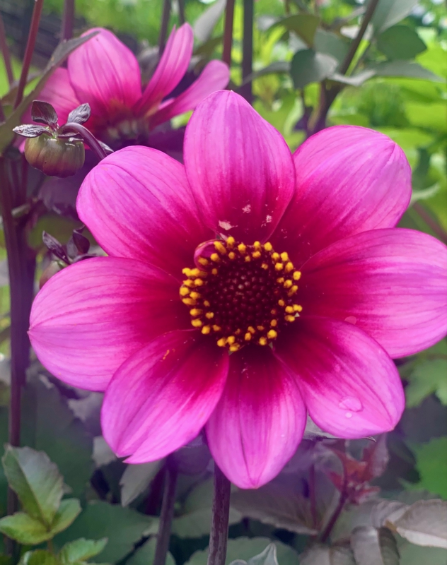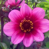 Enkelbloemig, opvallend is de grote rode ring in de bloem, donker blad.