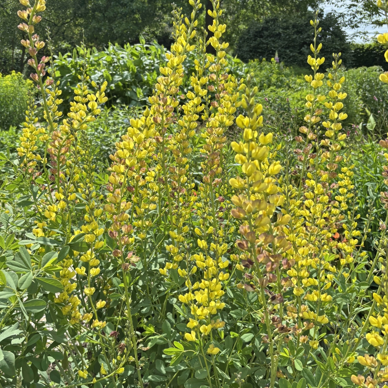 Lupine-achtige bloem, rijke bloei, bossige groei, verkleurt naar prachtig oranjebrons, fraaie peulen