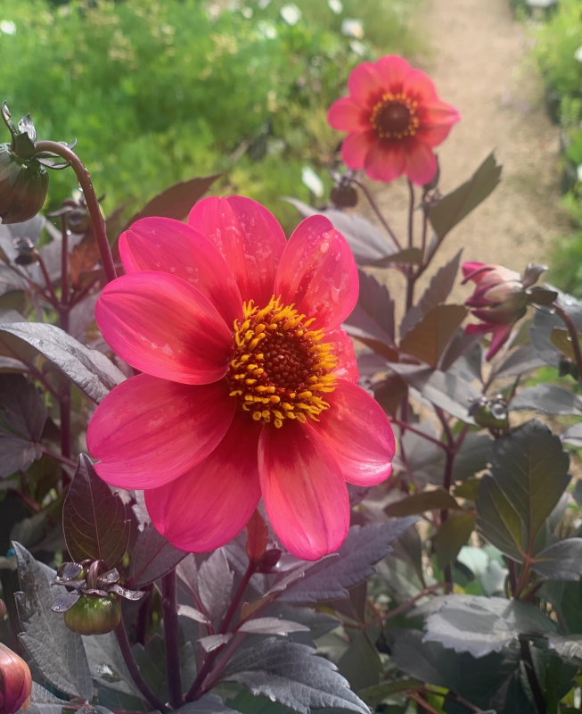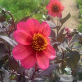 Enkelbloemige Dahlia, donkerpurper blad, gloeiend-rode krans rond hart van de bloem, prachtige variëteit!