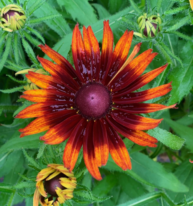 Zeer grote oranje straalbloem met dieprood hart, stevig vertakte behaarde stengel, bossige groeiwijze, zeer rijk- en langbloeiend, goed gedraineerde vrij droge grond, kortlevend, via uitzaaien behouden, insecten- en vlinderplant, oorspronkelijk afkomstig uit Noord-Amerika