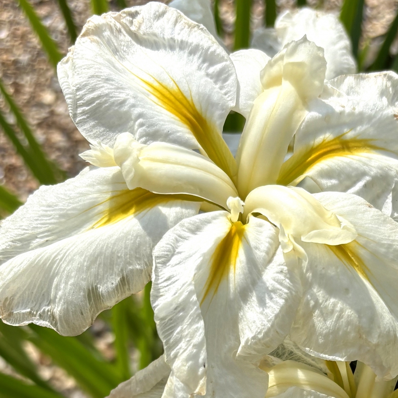 Grote, dubbele, afgeplatte bloem, iets geel in het hart, geurend, zwaardvormig, blauwgroen blad