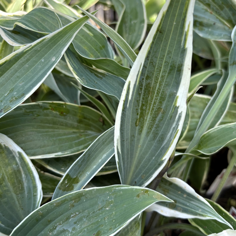 Opgaande soort, langwerpig, blauwgroen blad met golvende, witte rand