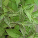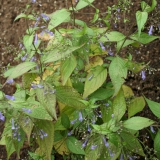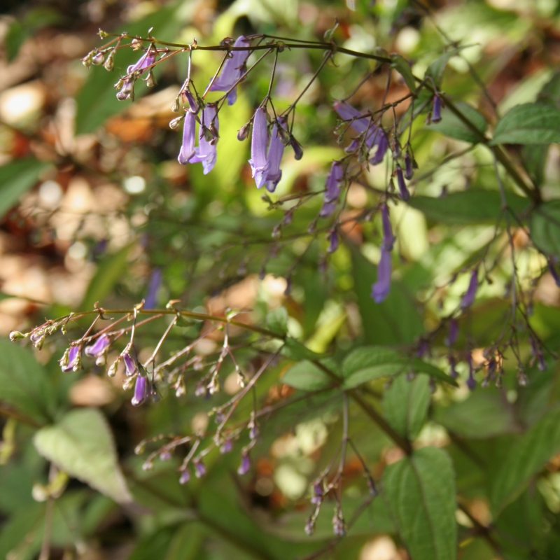 Syn. Rabdosia effusa, buisvormige langwerpige kleine bloem, grote losse bloempluim, zeer rijke bloei, purpergerand getand diepgroen blad met spitse punt en purperen nerven, elegante transparante heesterachtige groeiwijze, afkomstig uit Japan.
