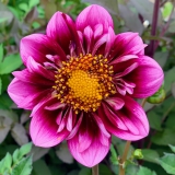 Hele bijzondere bloem, qua vorm en kleur, halfgevuld, iets gedraaide bloemblaadjes, geel hart, fraai iets rose getint groen blad, een schoonheid!