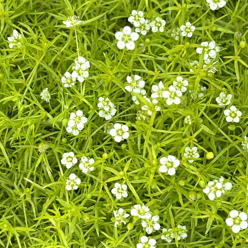 Mosachtige, beloopbare bodembedekker, oplichtende bladkleur, rijke witte bloei, ook mooi in rotstuin