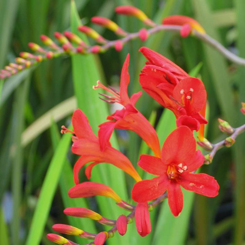 Trechtervormige bloem, breed zwaardvormig blad, zaaddozen, forse plant, vroegstbloeiende Crocosmia, knol, rijkbloeiend, droge warme plek, goede drainage, oorspronkelijk afkomstig uit Kaapregio in Zuid-Afrika