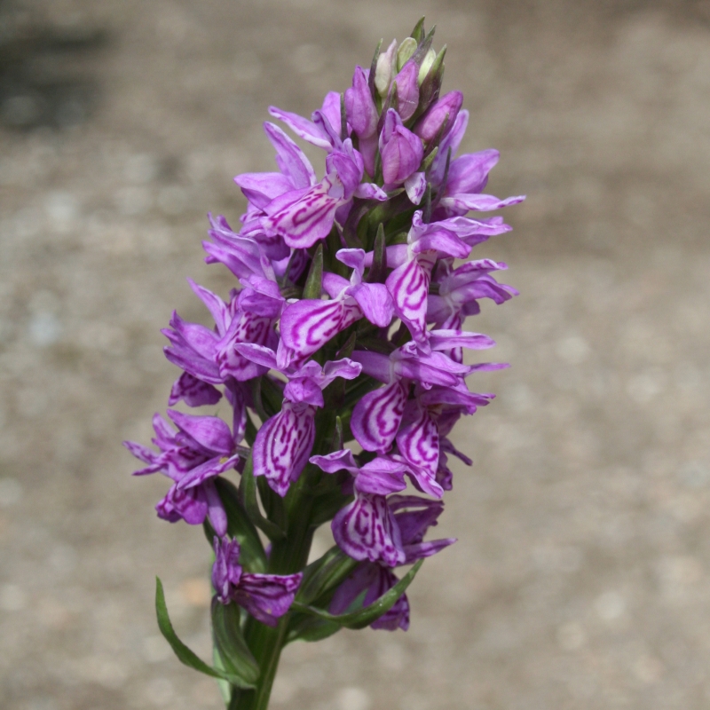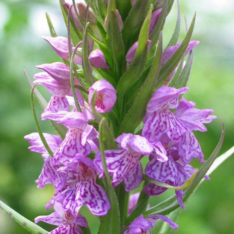 Volle bloemaar met mooi getekende bloemen, lang schutblad, variabele bloemkleur, lang smal blad met donkere vlekken, doosvrucht, vochtige plek, kalkrijke grond, afkomstig uit Europa, inheems.