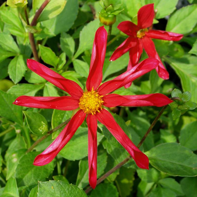 Windmill Dahlia, ver uit elkaar staande bloemblaadjes die bij het uitkomen opgerold zijn, goed doorlatende niet te droge voedzame grond, zeer rijk- en langbloeiend, uitgebloeide bloemen verwijderen, knol vorstvrij in donker overwinteren, vlinder- en insectenplant, oorspronkelijk afkomstig uit Mexico en Midden-Amerika
