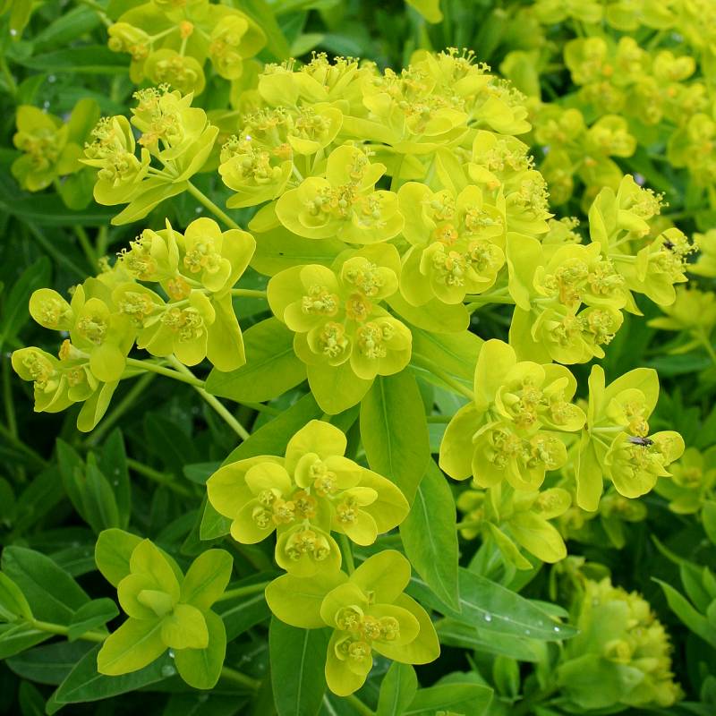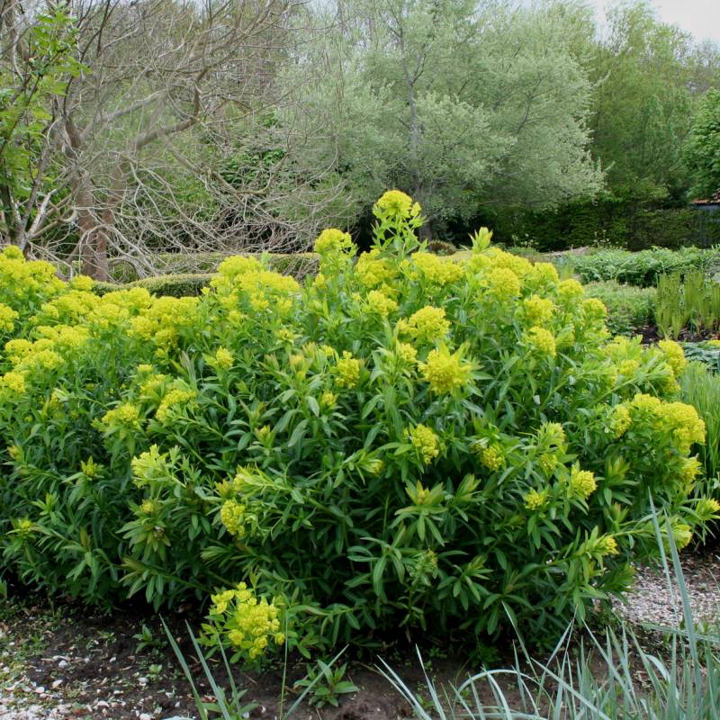 Kleine bloem met diepgeel rond schutblad, zeer brede luchtige bloemtros tot 20 cm doorsnede, langwerpig blad met lichte middennerf, stevige opgaande bossige groeiwijze, oranjerode herfstkleur, niet te droge grond, het witte plantensap kan allergische reactie veroorzaken, oorspronkelijk afkomstig uit de Himalaya, selectie van Hans Kramer