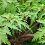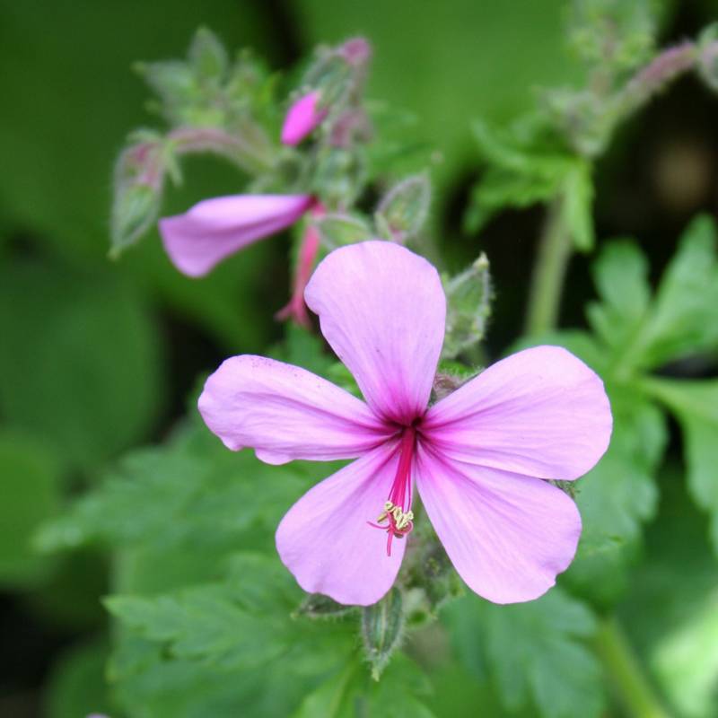 Grote purper geaderde kleverige bloem met donkerroze hart, zeer groot fijn vertakt bolvormig bloemscherm op donkere kleverige bloemstengel, zeer groot diep ingesneden glanzend aromatisch stevig groen blad (tot 60 cm!), rijk- en langbloeiend, zaad winnen (2 maanden laten liggen) omdat plant afsterft na bloei, maakt soms uitlopers, vorstvrij in licht overwinteren, afkomstig van Madeira