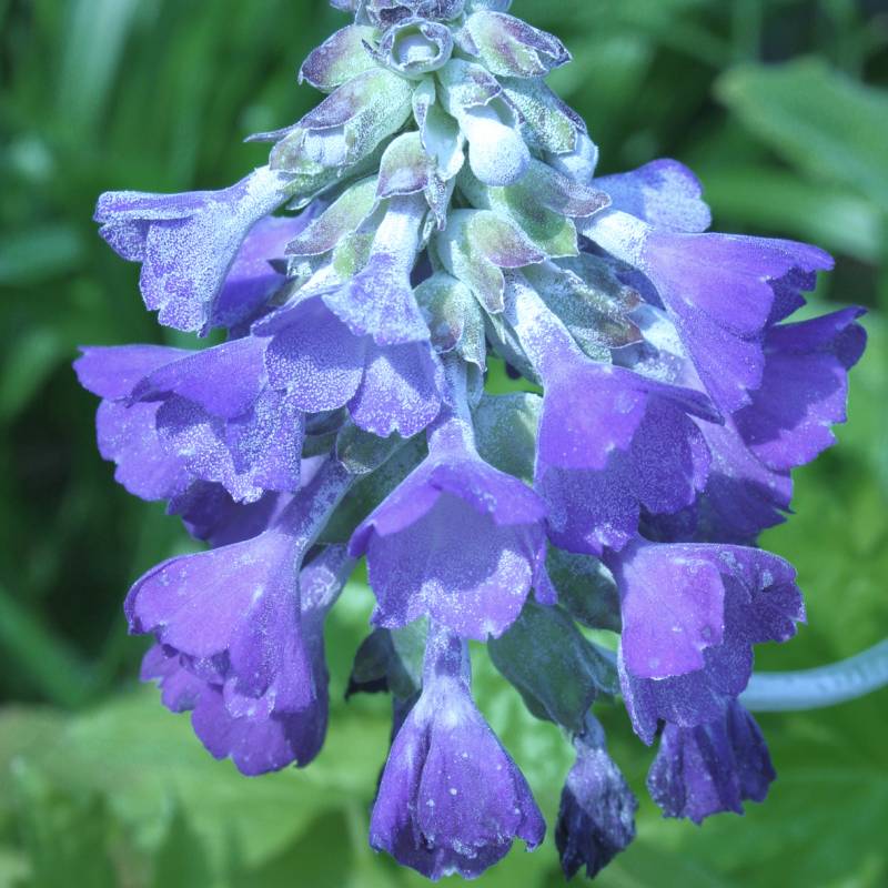 hangende trechtervormige bloem, gedrongen bloemtros op lange witbestoven stengel, sterkgeurend, rijk- en langbloeiend, lichtgroen ovaal getand blad, bladrozet, niet te droge goed gedraineerde grond (vooral 's winters niet te nat), afkomstig uit West-China