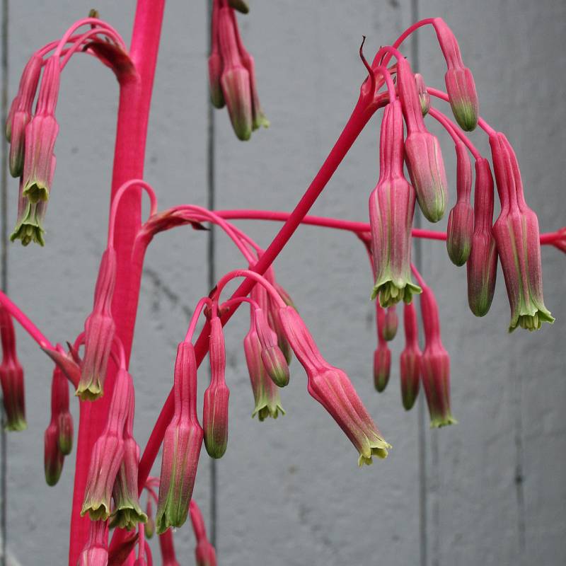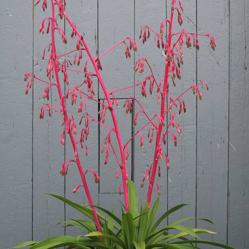 Zeer lange shocking-pink vlezige bloemstengel waaraan trossen glanzende buisvormige bloemen met groene punten, grijsgroenig zwaardvormig vlezig blad, wintergroen groot glanzend bladrozet, droge goed gedraineerde beschutte plek, vorstvrij overwinteren, afkomstig uit Mexico