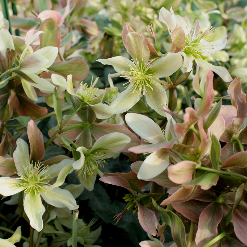 Grote komvormige, halfgevulde bloem, stevig, zilvergroen gemarmerd blad, wintergroen.