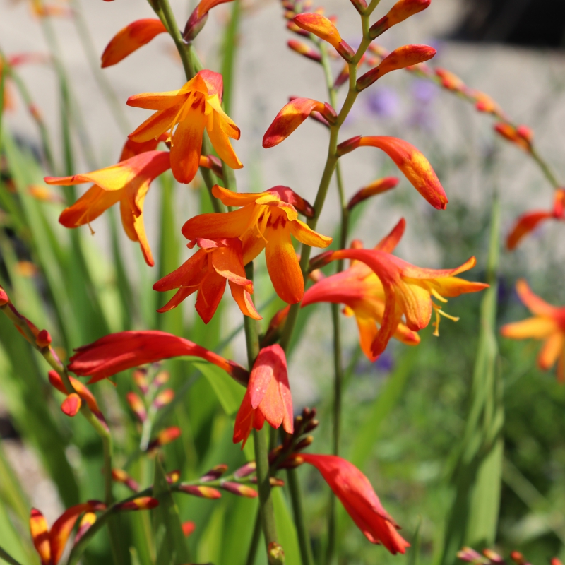 Kleine, tweekleurige, trechtervormige bloem met geel hart, zwaardvormig blad, knol, rijkbloeiend, droge warme plek, goede drainage, afdekken bij strenge vorst, oorspronkelijk afkomstig uit Kaapregio in Zuid-Afrika