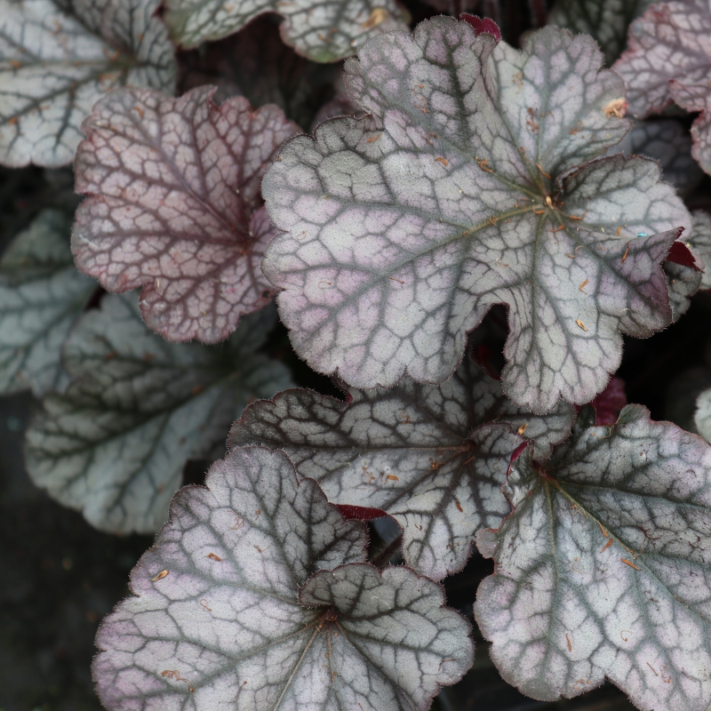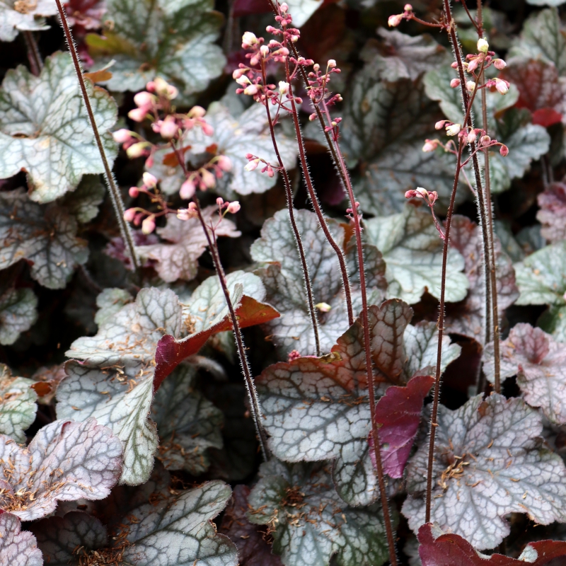 Afgerond, zilver-gemarmerd blad met paarse aderen en onderzijde, luchtige bloei, wintergroen