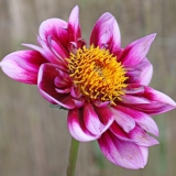 Hele bijzondere bloem, qua vorm en kleur, halfgevuld, iets gedraaide bloemblaadjes, geel hart, fraai iets rose getint groen blad, een schoonheid!