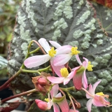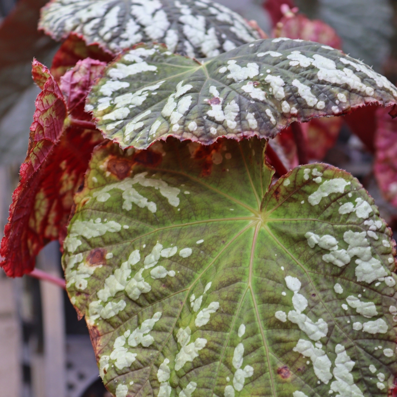 Opgaande Begonia met fraai getekend blad. Zwart-wit strepen worden steeds sterker.