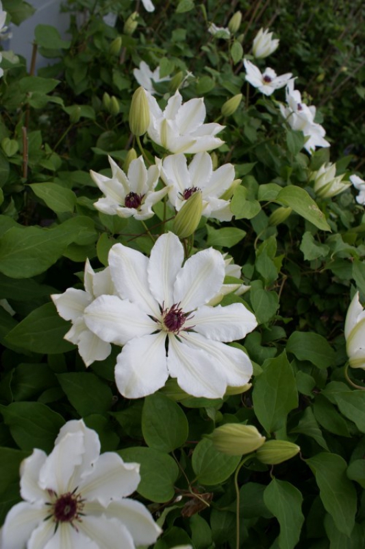 Patens Groep, grote enkele bloem met purperen meeldraden, ø 10-15 cm, windend, goede drainage, iets vochtige humusrijke grond, voet beschermen tegen felle zon, snoeien in juni op 75 cm, oorspronkelijk afkomstig uit Oost-Azië