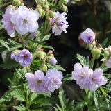 Mooie, gevulde bloem met paars hart en dito adertjes in de bloem. Na de bloei eventueel terugknippen